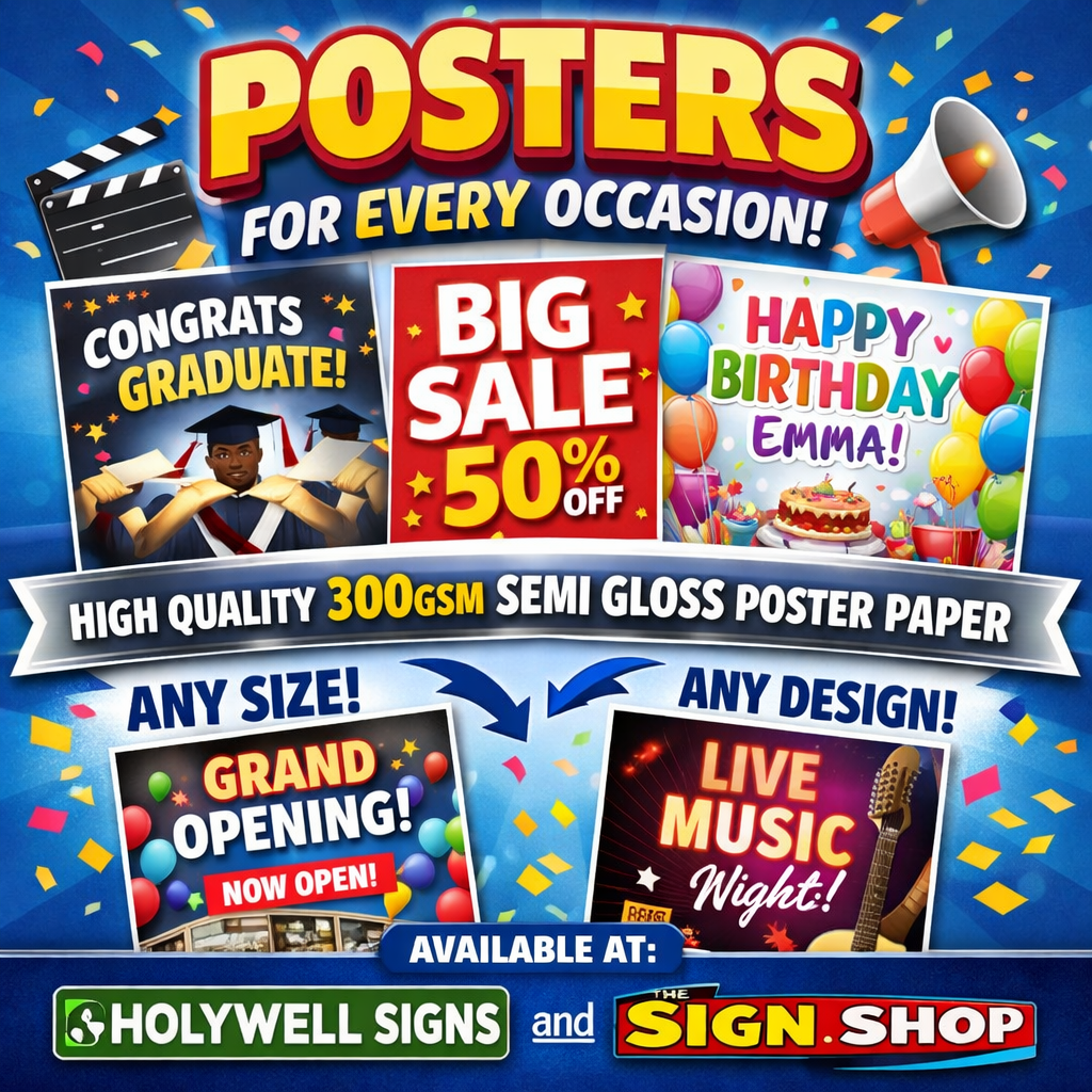 Looking for vibrant, professional poster printing? At Holywell Signs and The Sign Shop, we specialise in high-quality custom posters printed on 300gsm semi-gloss poster paper—perfect for both indoor and promotional use.